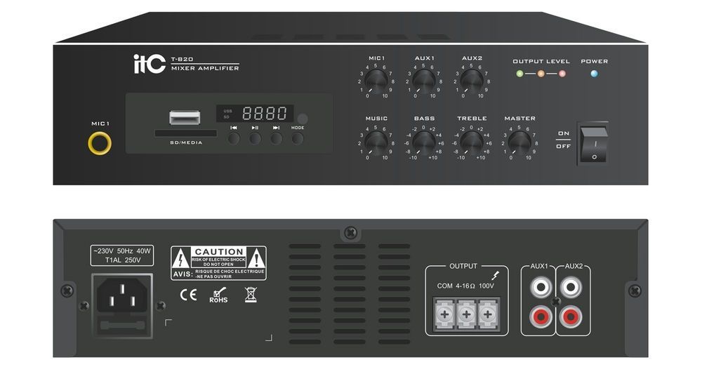 T-B40 ITC hỗ trợ công suất phát 40W, hỗ trợ phát nhạc MP3/Bluetooth. Chuyên sử dụng phát nhạc quảng cáo, nhạc nền tại quán cafe, quán ăn, shop, nhà hàng.... Tăng âm hỗ trợ cả loa trở kháng cao 100V Line và loa trở kháng thấp 4~16Ω