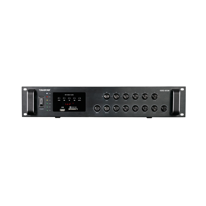EBS-24M Takstar - amply thông báo 6 vùng loa với công suất tổng lên tới 240W. Amply có sẵn mô-đun phát nhạc MP3 qua bluetooth hoặc USB và hỗ trợ loa trở kháng cao (70V / 100V). Ứng dụng chủ yếu trong phát nhạc, thông báo tại nhà hàng, nhà máy, siêu thị..