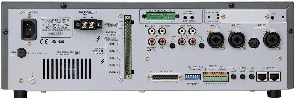 | Ngõ ra | Ngõ ra loa: Kiểu chân cắm (*7) 5 phím lựa chọn vùng loa với chiết áp (tất cả các zone có thể lựa chọn đồng thời) Ngõ ra loa trực tiếp: ngõ ra trực tiếp từ tăng âm tới biến áp ngõ ra (không qua chiết áp) Ngõ ra line: 0 dB(*3), 10 kΩ, kiểu giắc hoa sen Ngõ ra ghi âm: 0 dB(*3), 10 kΩ, kiểu giắc hoa sen Ngõ ra cho tăng bên ngoài: 0 dB(*3), 10 kΩ, kiểu giắc hoa sen |