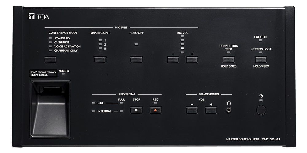 TS-D1000-MU có thiết kế đơn giản giúp kết nối dễ dàng với máy chủ tịch và máy đại biểu qua cáp LAN CAT5e STP. Bộ điều khiển trung tâm này được trang bị các chức năng ghi âm, điều khiển thông qua PC (* 1) và khả năng xác nhận kết nối một chạm.